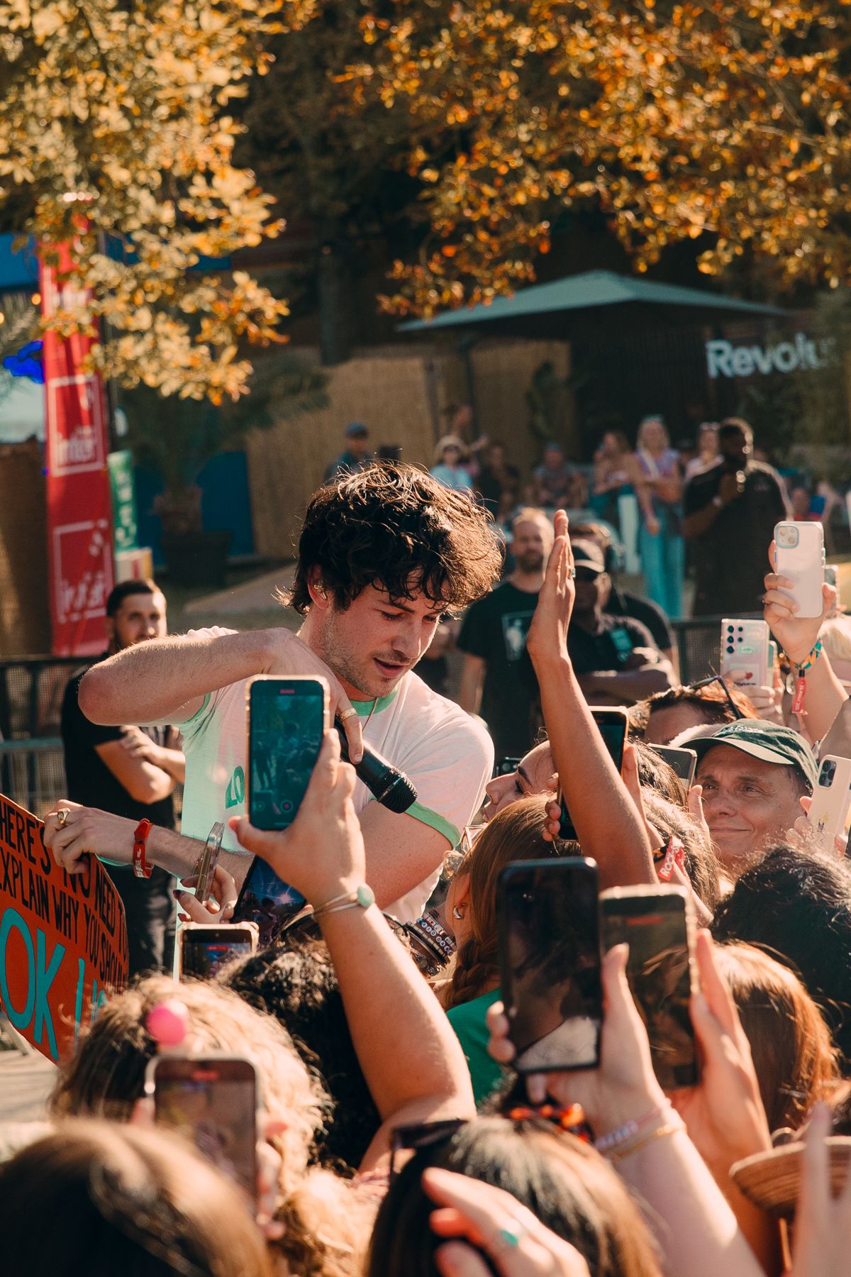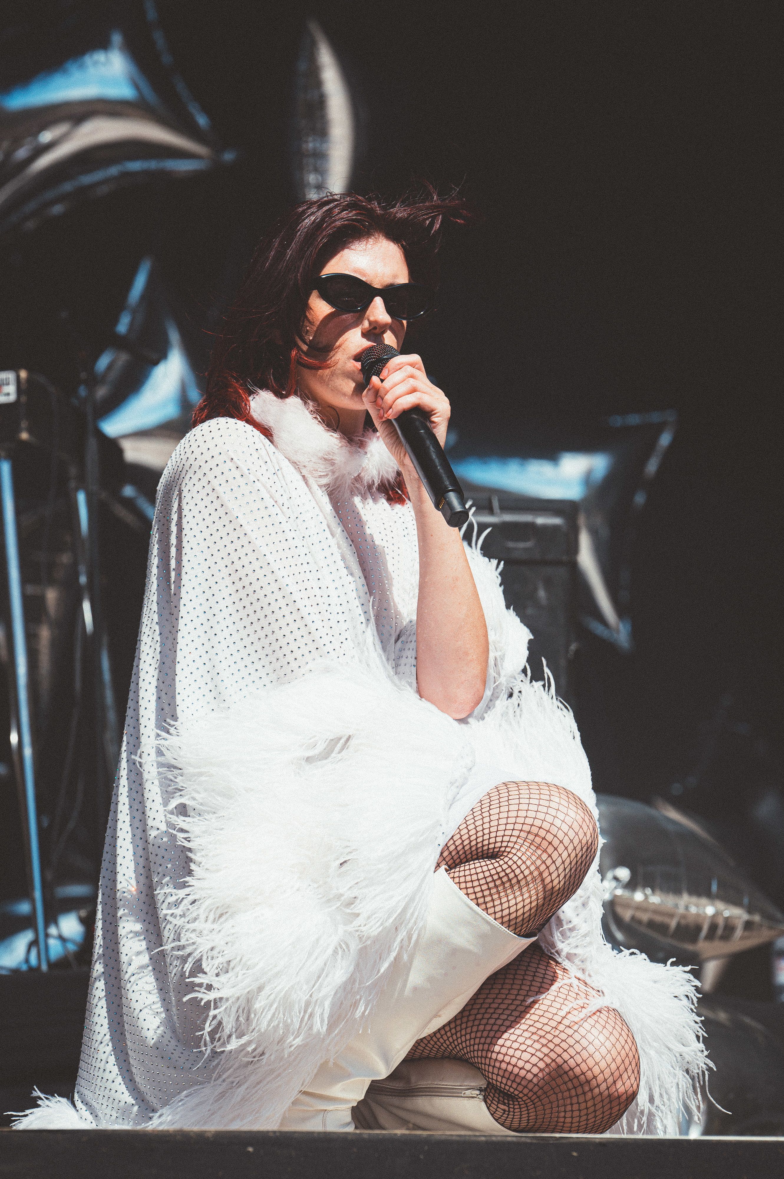 Fellow Irishmen Fontaines D.C. were next to take the stage, and swiftly stepped up to meet the high bar set by their newest release, Romance. The band was, frankly, effortlessly cool, standing insouciantly while tearing into the head-turning riff of ‘Here’s the Thing’. That’s excluding frontman Grian Chatten, who didn’t take long to stride down the catwalk, waving his arms vigorously to the deafening appreciation of his fans, many of whom had already been pumped full of adrenaline by the 1km dash from Kneecap’s stage.