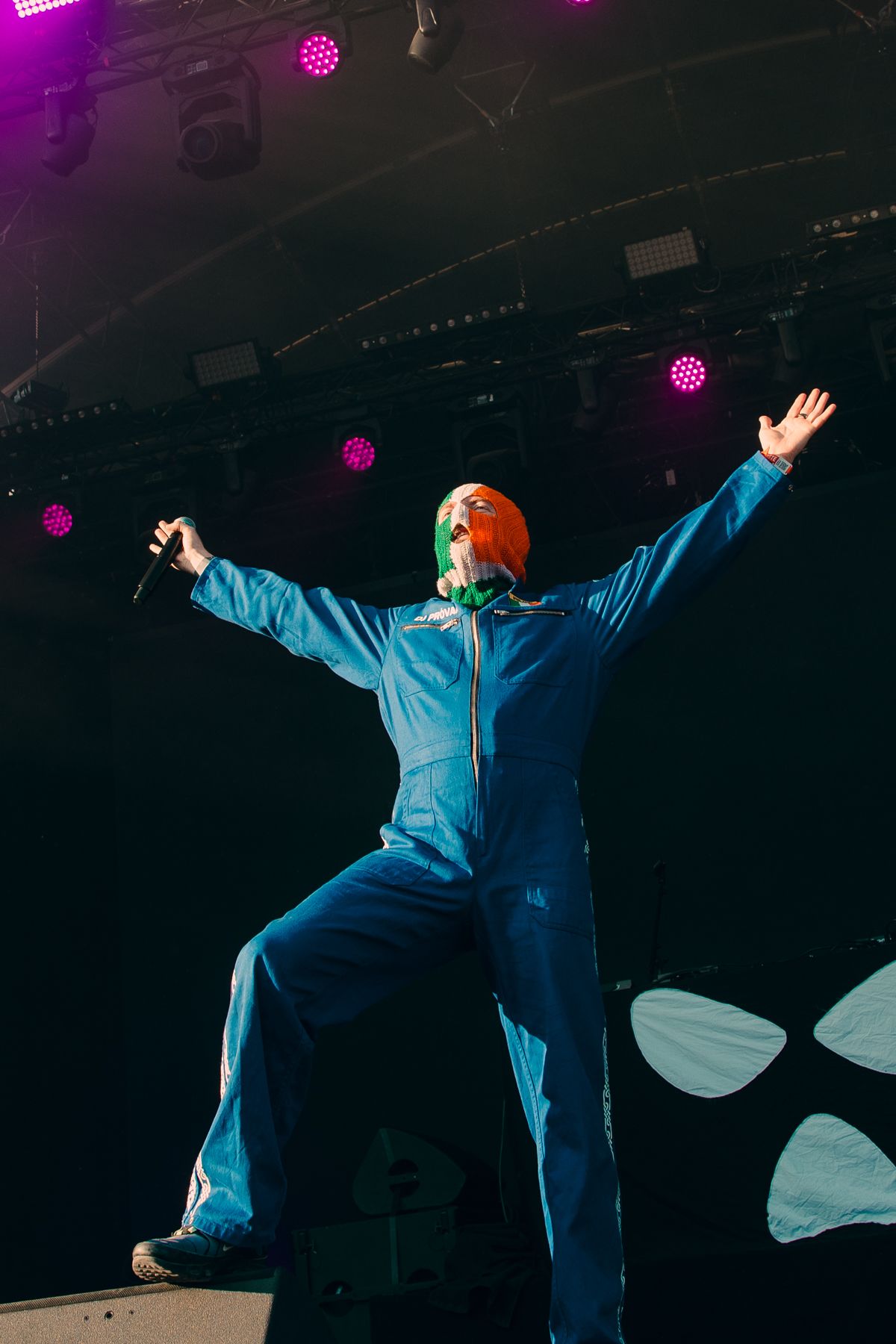 'Thart agus Thart' rapidly segued into 'Better Way to Live', with its moreish bass line and compelling vocal contribution from Grian Chatten of Fontaines D.C.. It's a shame that Chatten couldn't join the trio in person, given that he was only a few hundred metres away at the time preparing for his own set; he was instead given a cameo on screen behind the rappers.