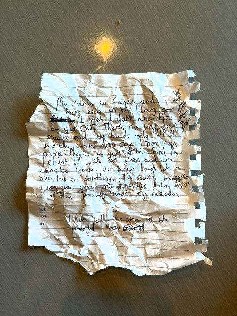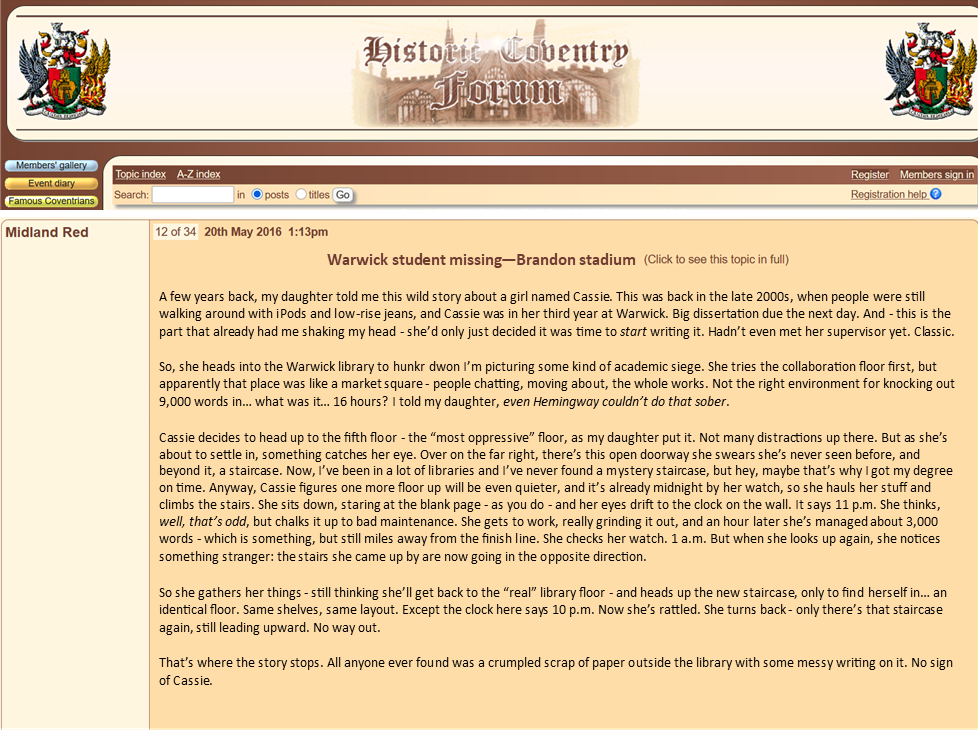 Confused, she collected her stuff and investigated, ambling up the stairs only to be met with an almost identical floor. That was until her eyes fell on the mounted clock, which read dead-on 10 pm. She turned back, desperate to get out of this nightmare, hoping it was a dream… only to be confronted by that same staircase, now leading upward once more. This is all we know of Cassie’s story, the only source for which comes from a scrawled, badly crumbled scrap of paper, found on the road outside the library, sometime after Cassie’s disappearance.